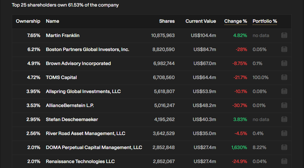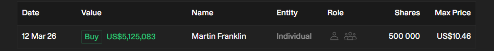 V poslední době došlo pouze k jedné transakci mezi vedením společnosti, konkrétně před pár týdny (12.3. 2026) Nakoupil Martin Franklin 500.000 kusů akcií za cenu 10,46$.