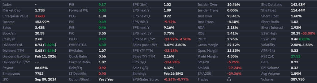 Fundament společnosti na první pohled působí velmi atraktivně z hlediska ocenění. Valuační násobky jako P/E (9,37) a forward P/E (5,03) jsou výrazně pod průměrem sektoru, což naznačuje potenciální podhodnocení akcie. Podobně nízké hodnoty vidíme i u P/B (0,46) a P/S (0,39), což znamená, že trh firmu oceňuje velmi konzervativně vůči jejím aktivům i tržbám. Na druhou stranu je potřeba dodat, že tato „levnost“ má své opodstatnění – investoři vnímají firmu jako rizikovou kvůli probíhající restrukturalizaci a slabšímu krátkodobému výhledu, což snižuje poptávku po akcii a drží její cenu nízko.
