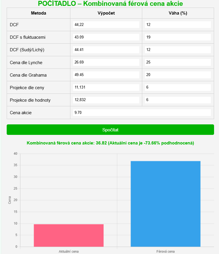 Díky tomu, že se firma nachází v restrukturalizaci, tak jsme upravili aktuální data spíše negativně (ponížili jsme FCF, zvýšili dluh a podobně) i přes to, že jsme čísla „optimalizovali“ pro negativnější scénář naše kalkulačka, která počítá cenu akcie na základě 7 výpočtů hlásí značné podhodnocení. Dle našeho výpočtu je na základě aktuálních a historických dat férové nacenění na úrovni 36,82$ za akcii.