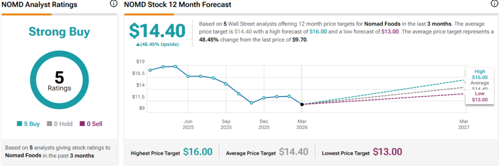 Dle stránek TipRanks na akcii společnosti Nomad Foods v současné době vypisuje cílové ceny jen 5 bankovních a analytických domů, s tím že nejnižší cílová cena je 13$ za akcii, nejvyšší 16$ za kus a průměrná cílová cena vychází o zhruba 18,5% dráž, než li cena aktuální. Mimochodem všechny analytické domy vnímají akcii jako podhodnocenou a i napříč aktuální situaci doporučují nakupovat.